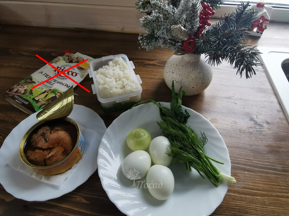 Для приготовления этого варианта потребуется: одна стандартная банка (230 г) натуральной печени трески, 3 яйца, 4-5 столовых ложек варёного риса и одна небольшая луковица. Если доступен ялтинский лук, то он придаст салату более насыщенный вкус.