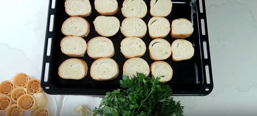 Завершают сборку композиции: подрумяненный хлеб, зелёная масса из творожного сыра, ломтики огурца и украшающая зеленая листовая подложка. Готовые закуски раскладывают на большом блюде и дополняют свежей зеленью.