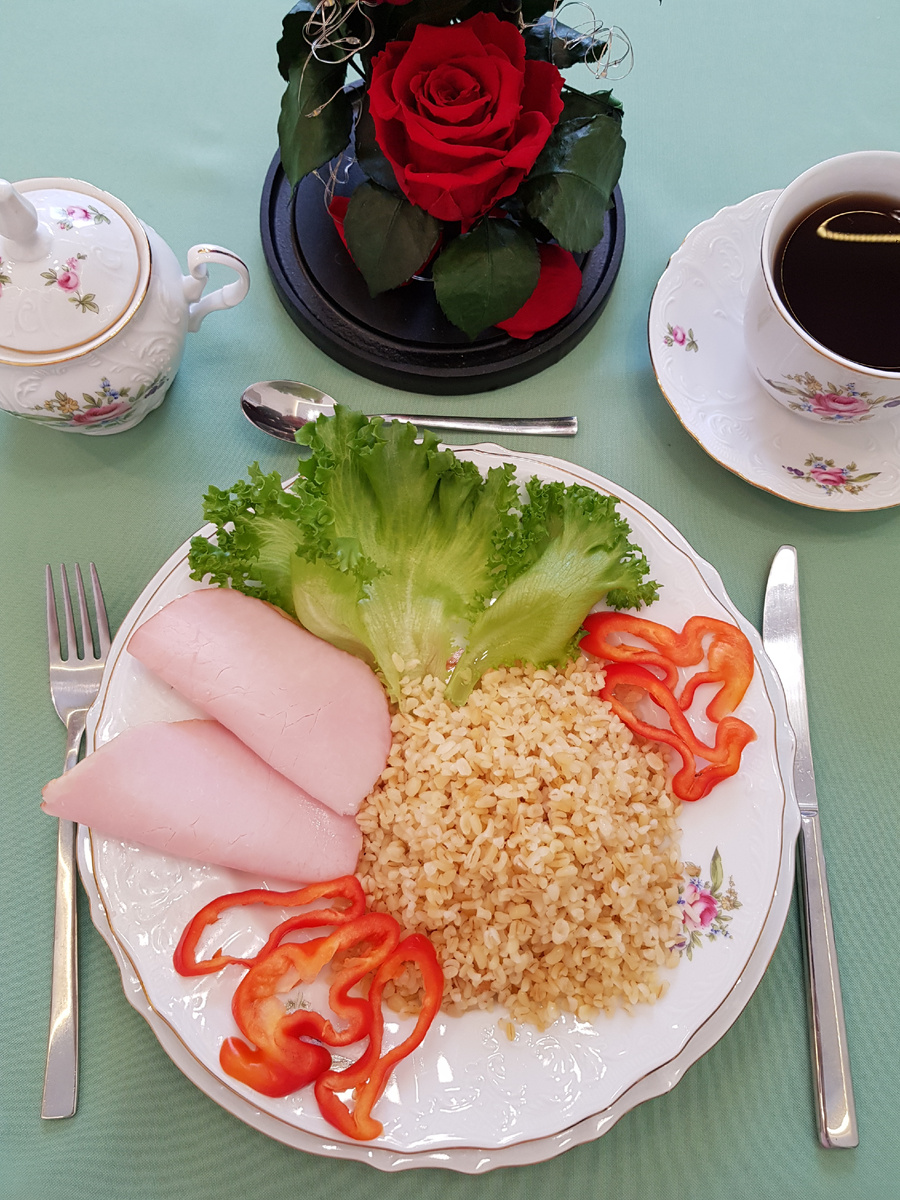 5. По окончании готовки раскладывайте булгур по тарелкам, добавляя порционные ломтики карбонада, свежий сладкий перец и листья салата для контраста во вкусе и цвета.