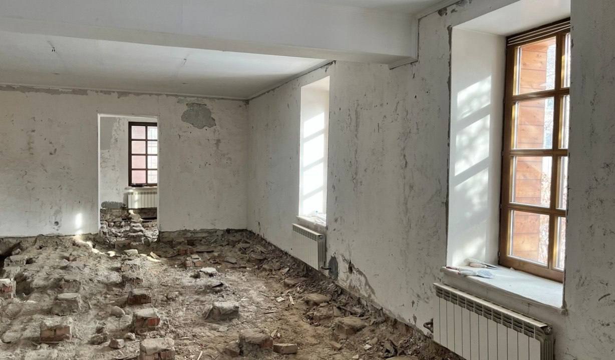 Подрядчик уже вышел на объект — идёт демонтаж, сняты старые полы. В рамках капремонта полностью обновят инженерные системы: электроснабжение, отопление, водоснабжение, охранную и пожарную сигнализацию. Также приведут в порядок полы, стены и потолки на двух этажах, заменят лестницу и двери.