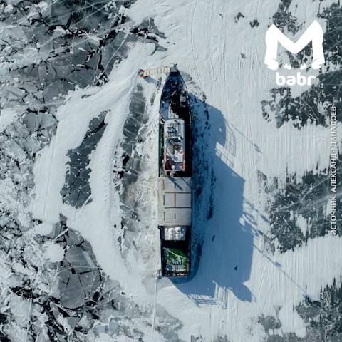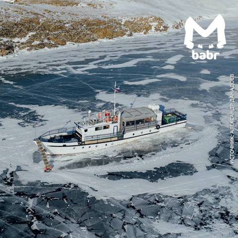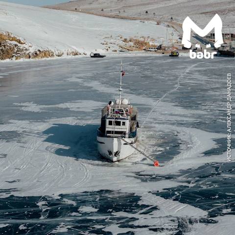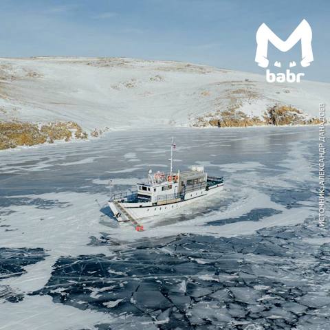 Корабль вмёрз в байкальский лёд. Теперь ему придётся задержаться там до весны — пока море-озеро не расцепит свои зимние объятия.