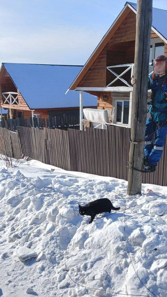 Сигнал поступил от местной жительницы: на ул. Пограничной на столбе застрял кот. На помощь отправились Максим Кутявин, Александр Куприянов и Алексей Копылов. Нашли кота быстро: чёрный, упитанный, с грустными глазами. Ни минуты не раздумывая, ребята экипировались, поднялись и сняли бедолагу.