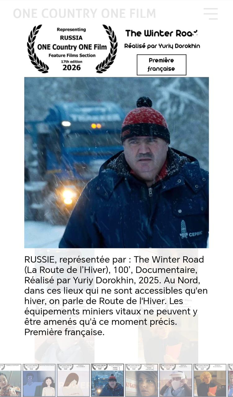 Документальный фильм «Зимник» режиссера Юрия Дорохина (фестивальное название The Winter road) покажут на 17-м Международном кинофестивале во Франции ONE Country ONE Film («Одна страна - один фильм»). Его проводят с 2010 года. От России «Зимник» оказался единственной картиной, заявленной в конкурсной программе в категории документальных фильмов.