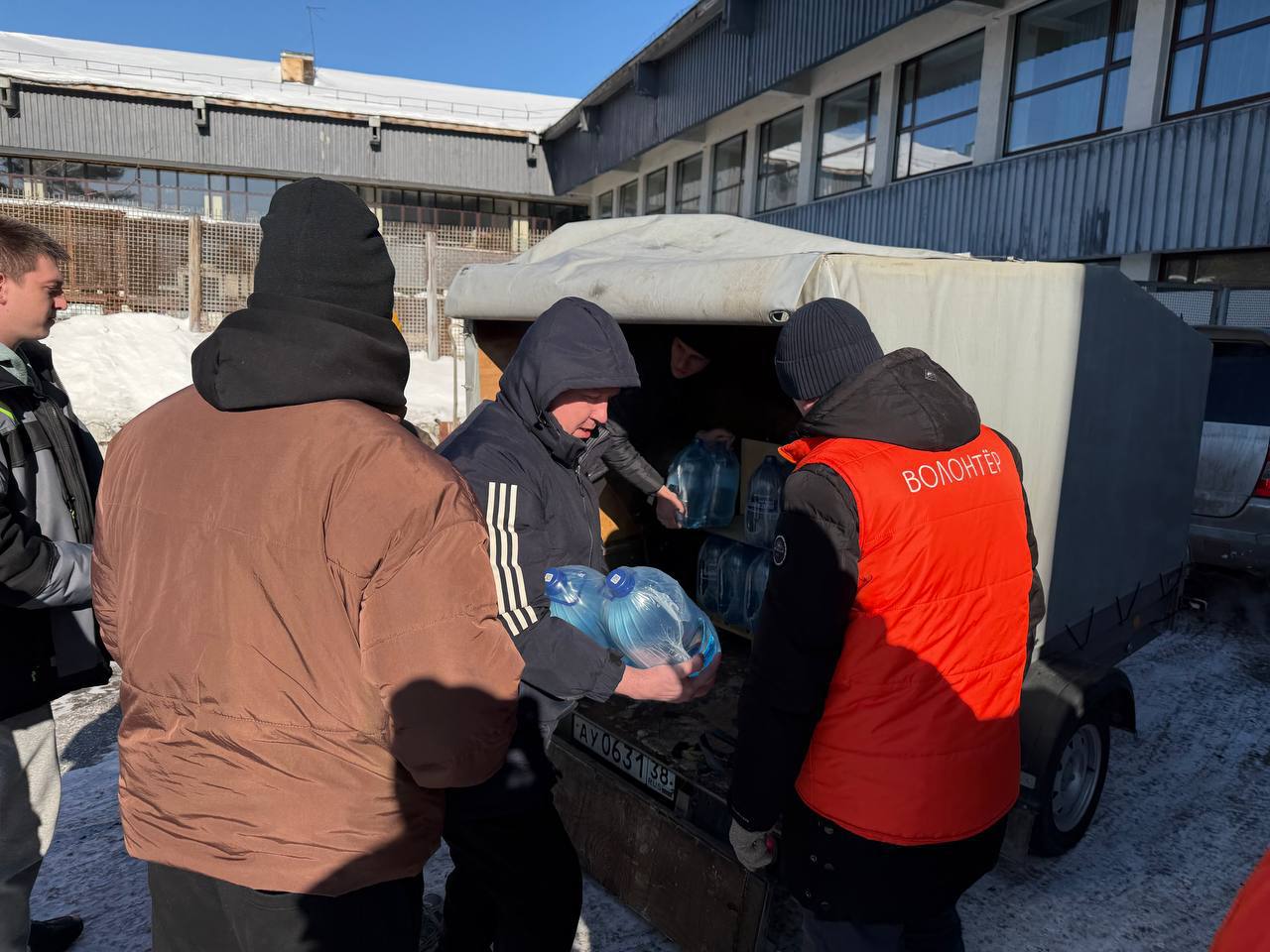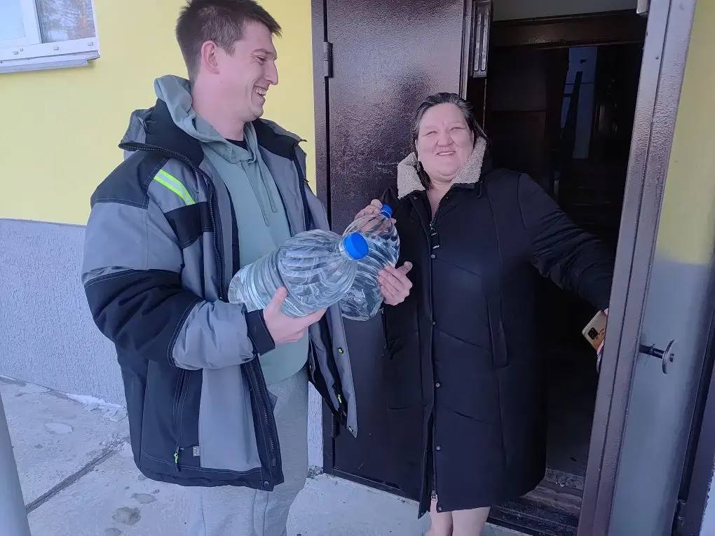 Волонтеры Эн+ и РУСАЛа развозят воду пострадавшим от коммунальной аварии шелеховчанам.