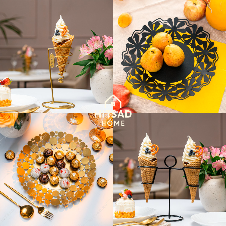 Сервировочные подставки от HiTSAD Home созданы для тех, кто ценит стиль и уют в каждодневной жизни. Элегантные металлические конструкции идеально подходят для подачи мороженого, закусок и даже тарталеток, effortlessly вписываясь в любой интерьер — от современного минимализма до традиционного прованса.
