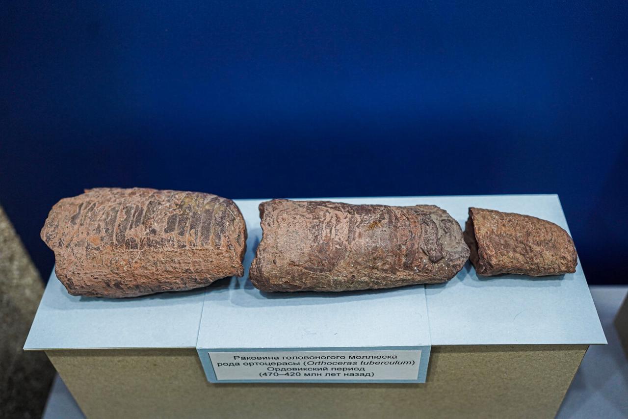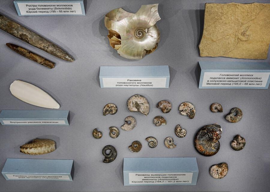 В экспозиции представлены раковины, ростры, фотографии моллюсков ныне живущих и ископаемых.