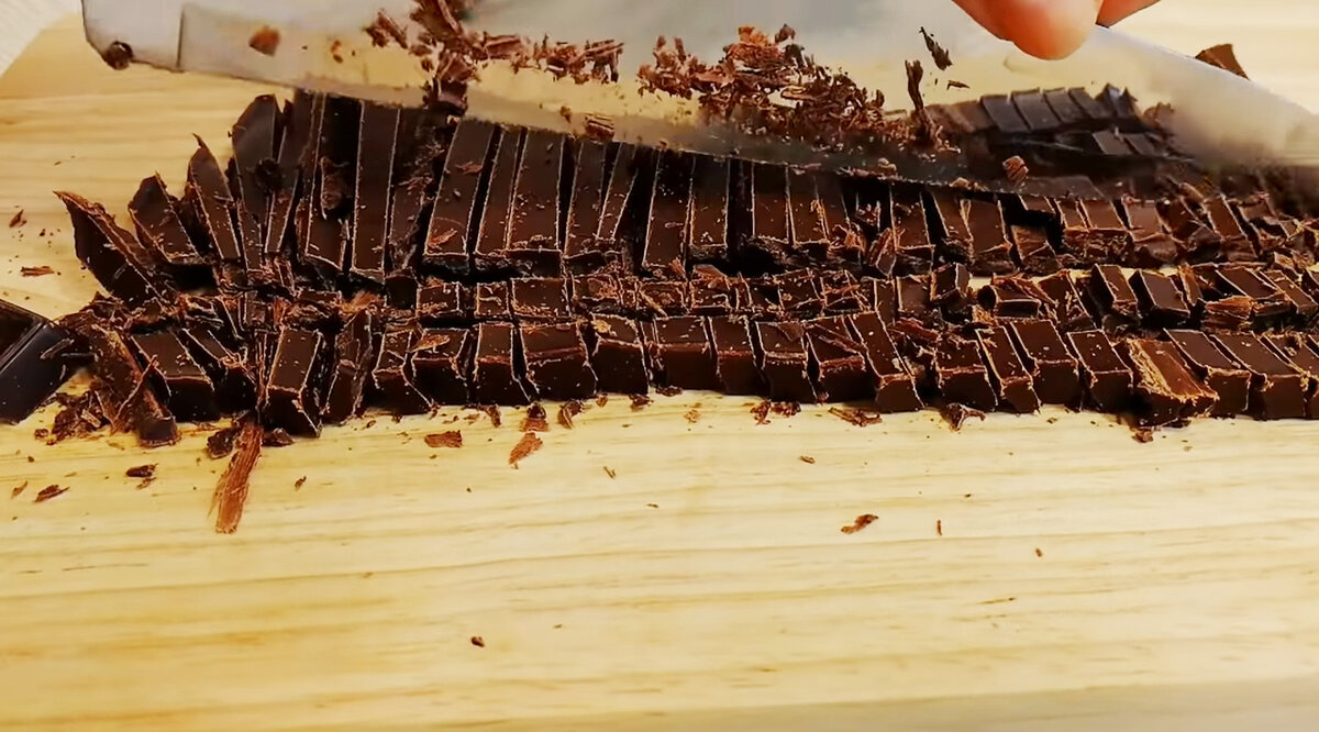 Шоколад нужно мелко нарезать, чтобы он легче растаял. После этого кладем его в кастрюлю и добавляем воду. На небольшом огне, постоянно помешивая, растапливаем шоколад.