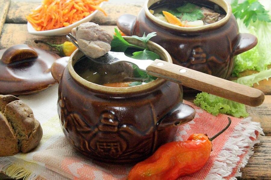 Затем в керамические горшочки укладываются сначала обжаренные куски свинины, сверху – овощная смесь, а в завершение – нарезанный картофель. Добавить половинки лаврового листа, немного соли и зелени сельдерея для усиления аромата.