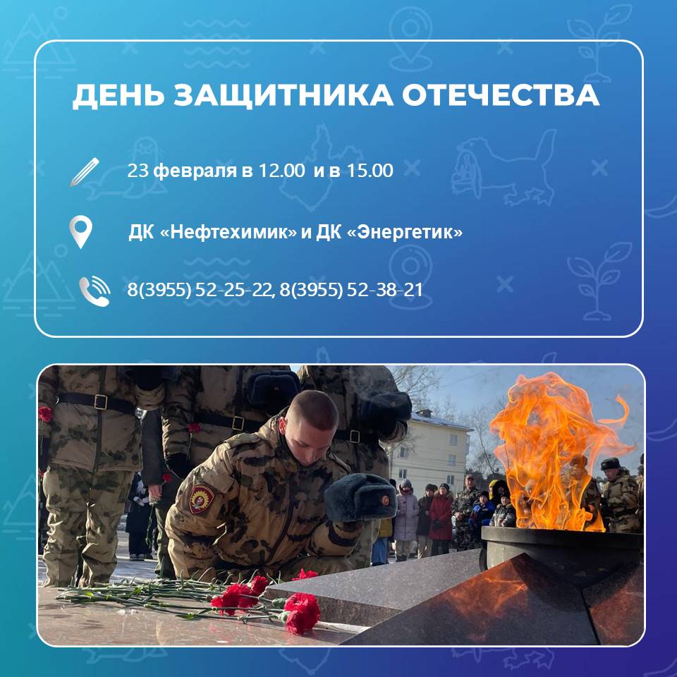 Праздник концертными программами отметят 23 февраля в ДК «Нефтехимик» в 12.00 и в ДК «Энергетик» в 15.00. Вход свободный!