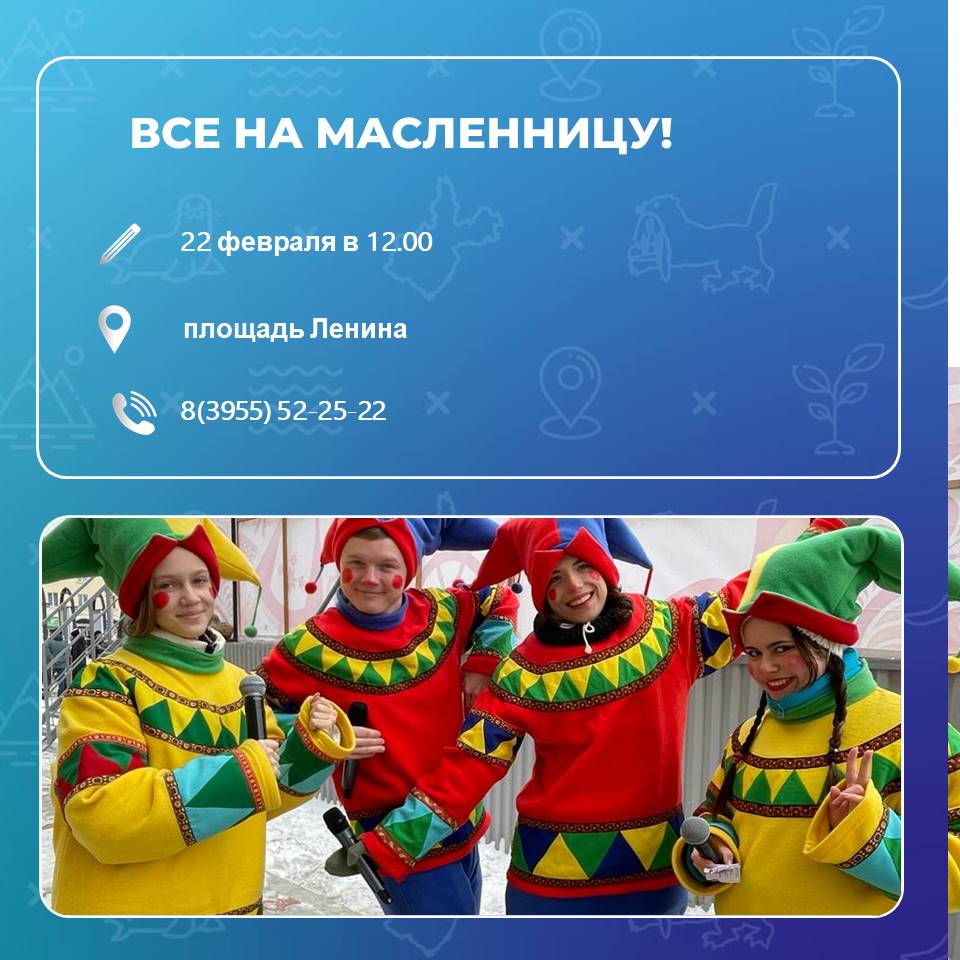 Масленичные гуляния развернутся на нескольких площадках Ангарского округа 22 февраля. В 12.00 запланирована яркая концертная программа на площади Ленина. Отметить проводы зимы приглашают в традиционных русских головных уборах – кокошниках. Самых активных и оригинальных отметят. Подробнее – читайте здесь.