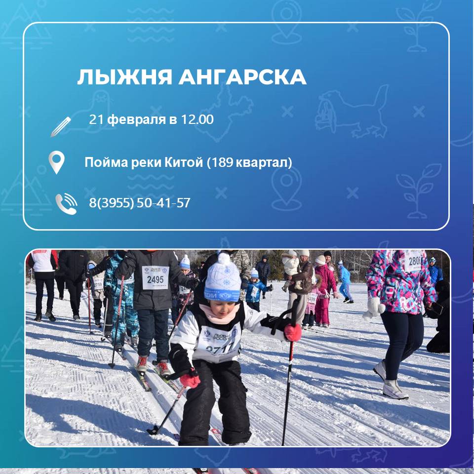Любителей самого зимнего вида спорта ждут в эту субботу, 21 февраля, в пойме реки Китой в 189 квартале. Регистрация участников на «Лыжню Ангарска» начнется с 10.45. Официальное открытие – в 12.00. Дистанции – 5000 метров для взрослых и 500 метров для детей. Уточнить информацию можно по телефону 8(3955)50-41-57.