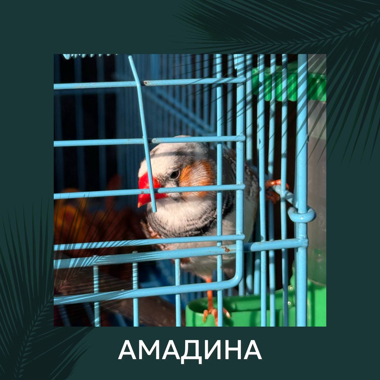 Птичка — жизнерадостный самец зебровой амадины (этот вид родом из Австралии). Наш самый активный строитель: он весь день занят важным делом — собирает, разбирает и снова вьет свои гнезда, не забывая при это общаться с гостями оранжереи.