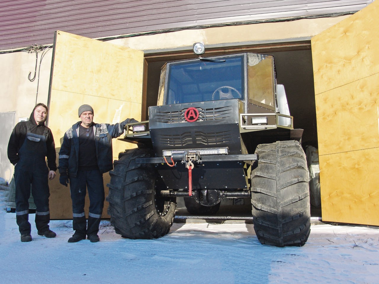 Первый опыт вездеходостроения Леонид Рудой, Станислав Белов и их коллеги приобрели в 2015 году. Купили три автомобиля — уазик, «Ниву» и ВАЗ 2109 и взялись конструировать. В итоге из трех получилась одна машина на больших колесах. Кузов взяли от «Нивы», подвеску — от уазика. «Девятка» стала донором автомобильного сердца — в создаваемый вездеход вживили вазовский мотор.