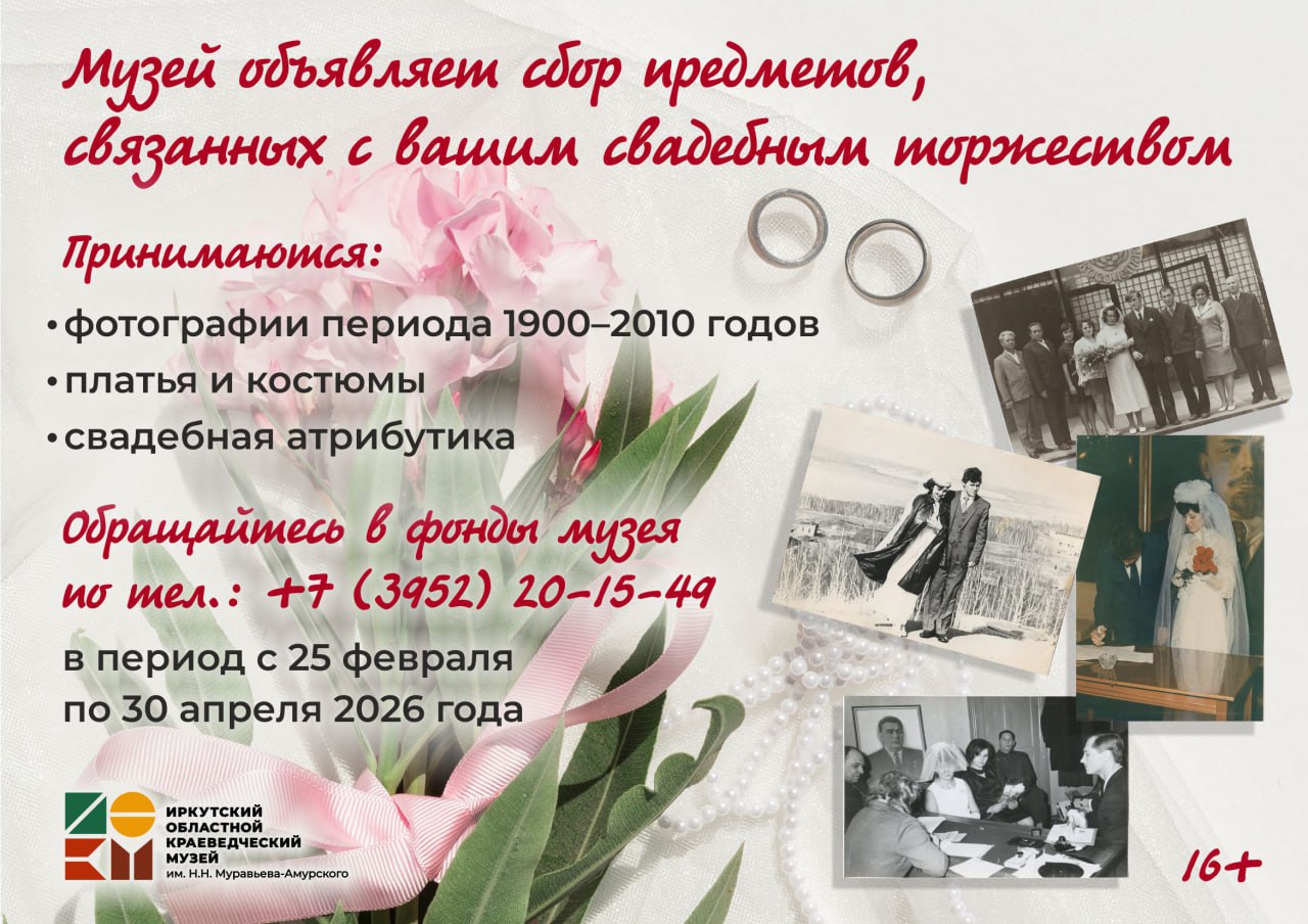 Поделиться семейной историей и попасть с ней в историю городскую: Иркутский областной краеведческий музей имени Н.Н. Муравьева-Амурского собирает коллекцию, посвященную свадебным традициям XX-XXI веков, и приглашает всех желающих внести свой культурный вклад.