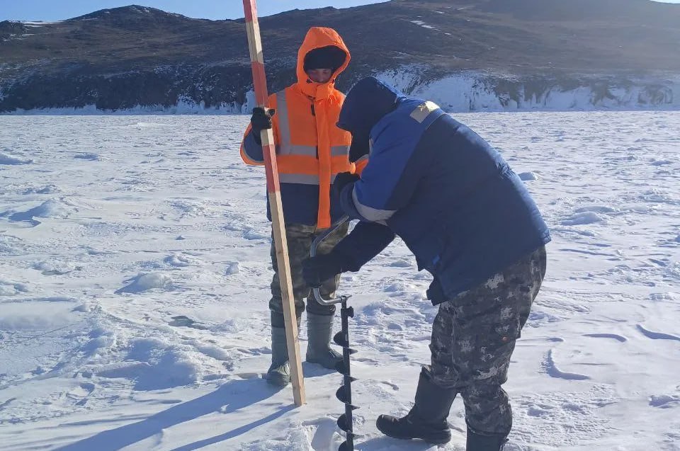 Автогрейдер расчищает ледовое поле для создания проезжей части. При помощи мотопомпы специалисты подрядной организации заливают трещины. Вдоль полос движения устанавливают вешки. Задействовано 22 специалиста и 4 единицы техники. Ход работ контролирует директор ОГКУ «Дирекция по строительству и эксплуатации автомобильных дорог Иркутской области» Петр Демидов.