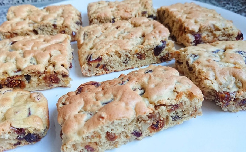 При приготовлении взбивайте яйца до лёгкой пены, затем добавьте сахар и ванильный сахар. Постепенно подсыпайте муку и разрыхлитель, не забывая добавлять орехи и сухофрукты в конце, чтобы сохранить текстуру. Выпекайте 20 минут при 180 градусах, пока поверхность не покроется золотистой корочкой.