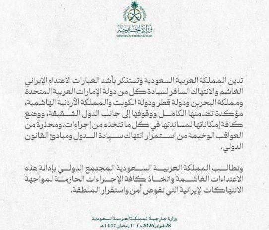 «Королевство Саудовская Аравия самым решительным образом осуждает жестокую иранскую агрессию и вопиющее нарушение суверенитета Объединенных Арабских Эмиратов, Королевства Бахрейн, Государства Катар, Государства Кувейт и Иорданского Хашимитского Королевства, подтверждая свою полную солидарность и поддержку братским странам и предоставляя им все свои возможности для поддержки во всех предпринимаемых ими мерах, а также предупреждая о серьезных последствиях продолжающегося нарушения суверенитета государств и принципов международного права».