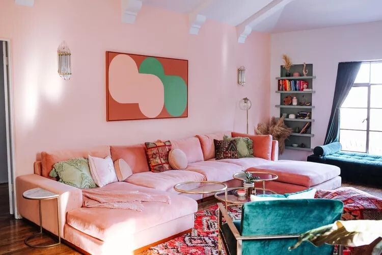 Для большой стены подойдут массивные картины. Если выставка из настенных галерей сейчас не в моде, то тренд на крупные живописные полотна остаётся вне времени. Например, смелое сочетание «королевского синего» и яркого апельсинового создаст невероятный визуальный эффект и наполнит комнату энергией.
