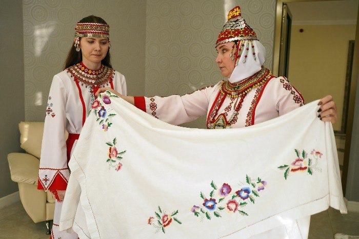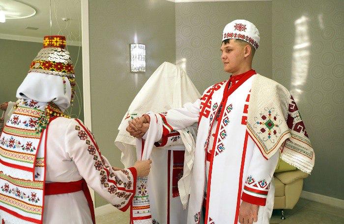 По словам Лили Бабокиной, мамы невесты, национальные костюмы были арендованы у жителей села Чикан, где проживает много чувашей. Наряды сибиряки специально заказывали у мастеров на исторической родине, так что в подлинности костюмов сомневаться не приходится. Мужские и женские наряды шьют из белой ткани, которая считается у чувашей символом чистоты. В богато вышитом орнаменте преобладает красный цвет, символизирующий защиту от всего плохого. Зеленый цвет означает жизнь, а черный – землю. Одно из главных отличий в костюмах девушки и замужней женщины – головной убор. Голову невесты украшает тухья, остроконечная шапка, своей формой напоминающая шлем. Тухья может быть украшена серебряными монетками или вышита бисером. Наряд замужней женщины вершит хушпа.