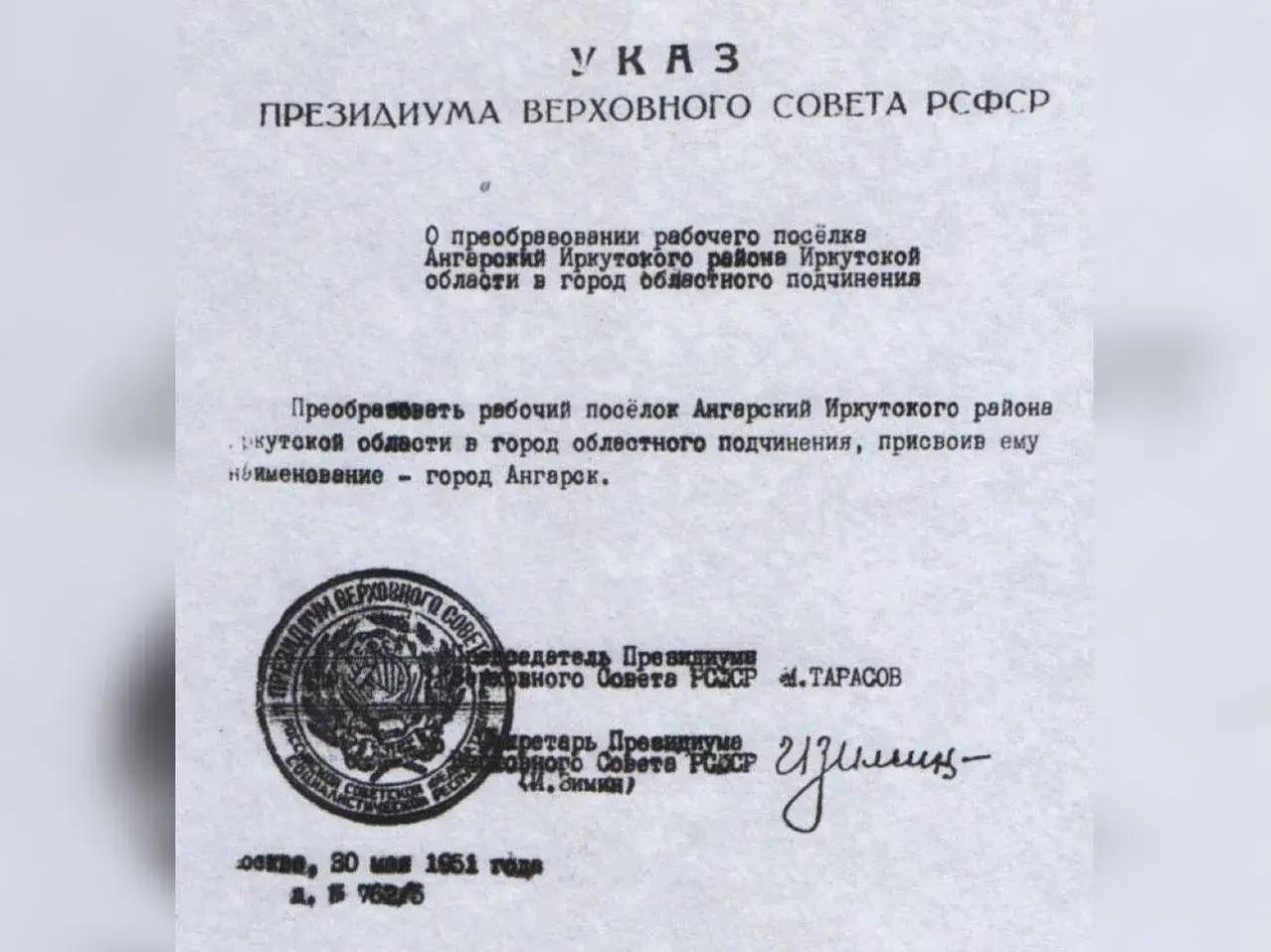В итоге Указом Президиума Верховного Совета РСФСР 30 мая 1951 года рабочему поселку присвоено наименование «город Ангарск». Подписи под документом поставили председатель Президиума Верховного Совета РСФСР Михаил Петрович Тарасов и секретарь Президиума Иван Николаевич Зимин.