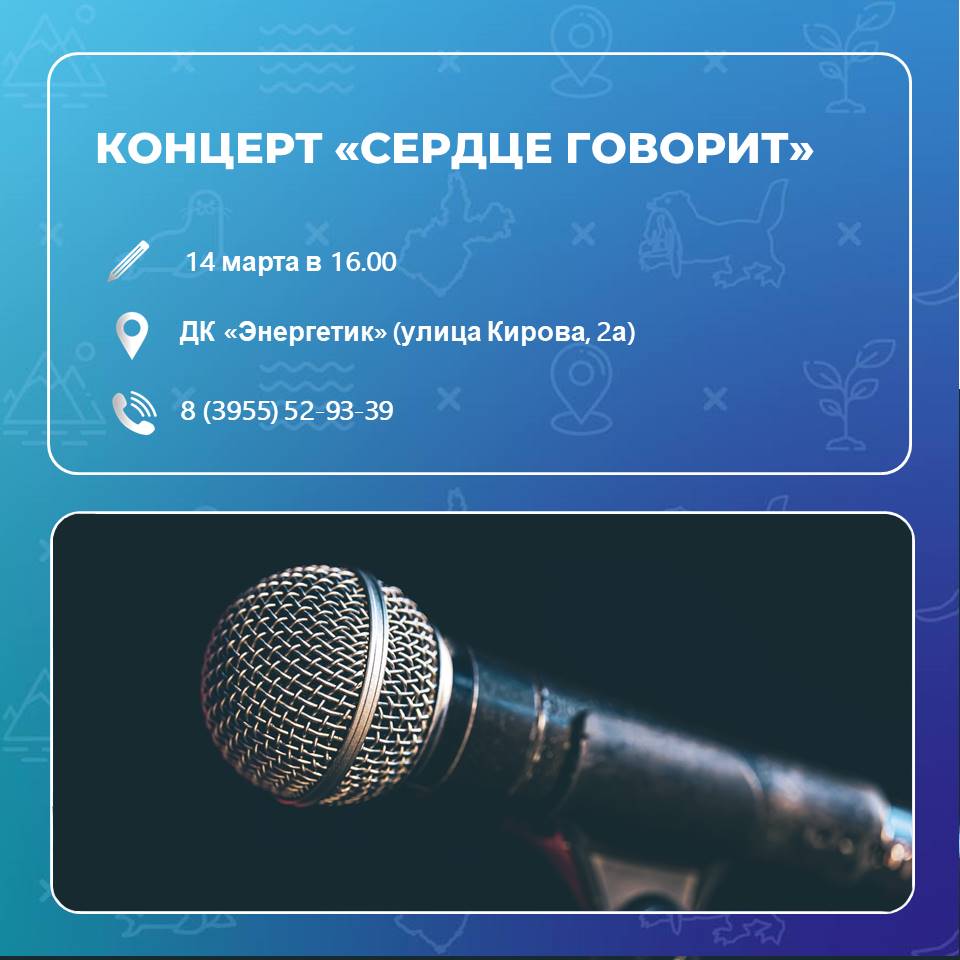 Жителей Ангарского округа приглашают 14 марта на концерт в ДК «Энергетик». Потрясающие голоса и композиции подарят солистки Дворца культуры Татьяна Скоробогатова, Юлия Котова, Анастасия Губанова. Начало в 16.00. Справки по телефону 8(3955)52-93-39.