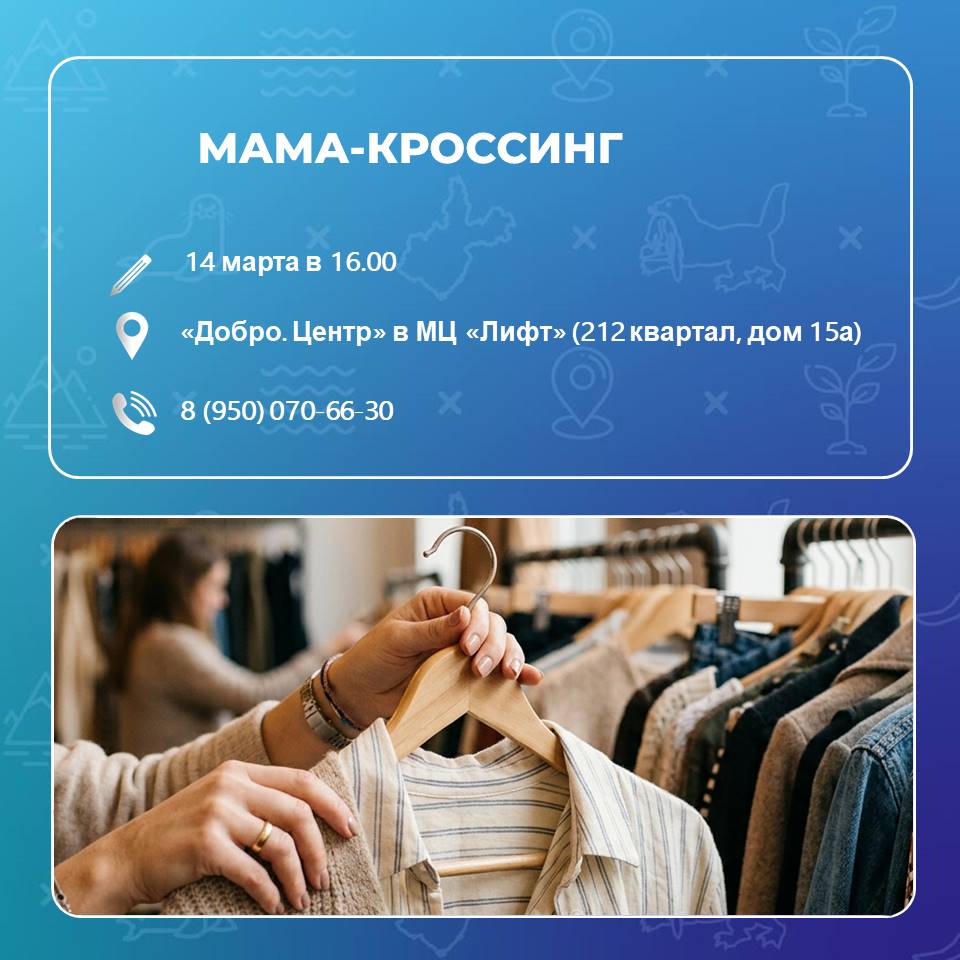 После очередного разбора гардероба осталось много вещей? Надоели разбросанные по дому детские игрушки? Решение есть! Приходите 14 марта на «Мама-кроссинг» и подари то, что не жалко отдать – сумки, одежда, аксессуары, игрушки. Забота об экологии, обмен вещами и приятное общение. Всех ждут в «Добро.Центре» по адресу 212 квартал, дом 15а в 16.00. Подробности по телефону 8 (950)070-66-30.