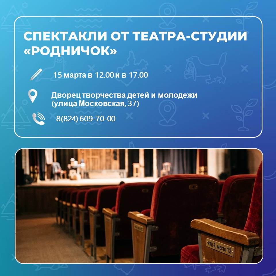 Образцовый театр-студия «Родничок» 15 марта покажет два спектакля во Дворце творчества детей и молодежи (улица Московская, 37). В 12.00 маленьких зрителей приглашают на «Волшебную шкатулку». А в 17.00 начнется спектакль «Вечно живые». Истории о любви, выборе и цене человеческой жизни в годы войны. Справки по телефону 8(924)609-70-00.