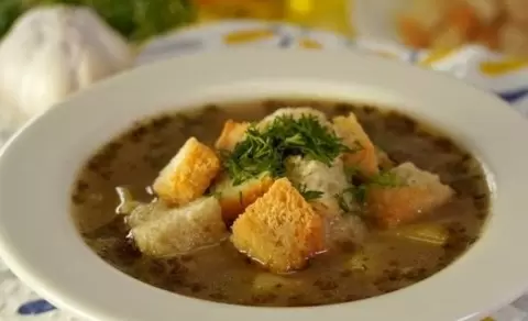 - Подаем суп с хрустящими сухариками и посыпаем свежим укропом для аромата.