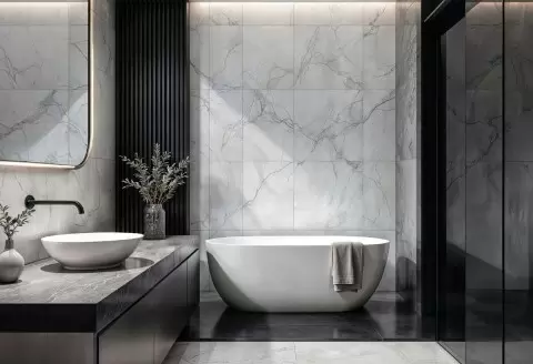 - Чёрный: Драматичный и таинственный цвет, который при правильном использовании может добавить глубины и роскоши. Рекомендуется применять его в просторных ванных с хорошим освещением.