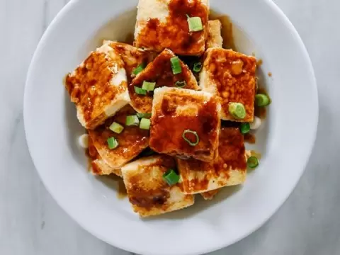 5. Подача: Полить тофу соусом, посыпать нарезанным зелёным луком и подавать горячим.