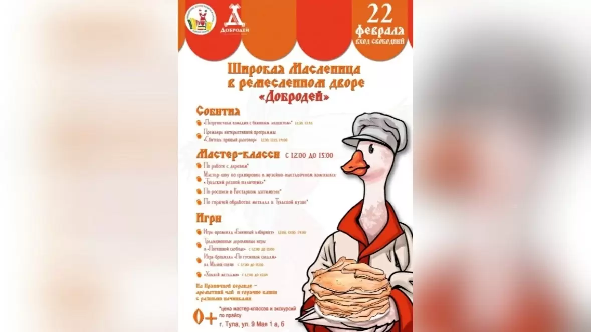 22 февраля ремесленный двор «Добродей» откроет свои двери для всех желающих насладиться праздником Широкой Масленицы. Это мероприятие обещает быть насыщенным и увлекательным благодаря разнообразным народным играм, вкусным угощениям и мастер-классам.