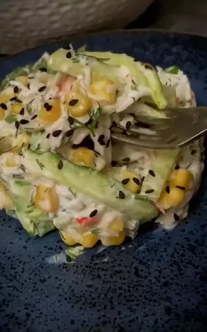 - В большой салатнице соедините крабовые палочки, огурцы, кукурузу и зелень.