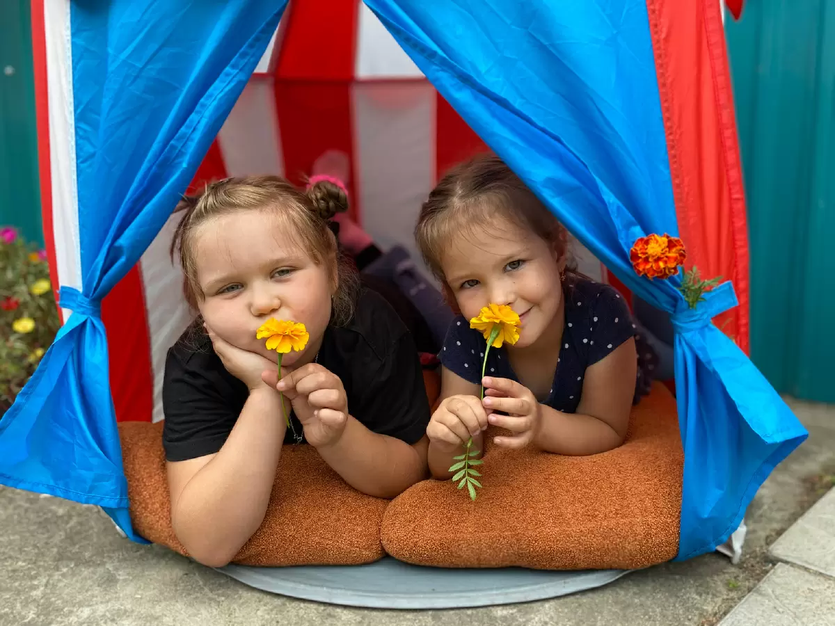 После сытного перекуса жизнь продолжалась в духе творчества. Ведь кто из нас не варил кашу из песка и воды, собирая в кулачки цветы и украшения для своих "блюд"? Даше и Марьяше не нужно было долго думать: они решили устроить свое маленькое кулинарное представление, в роли юных поварят, на которых легко натянуть "профессиональную" униформу.