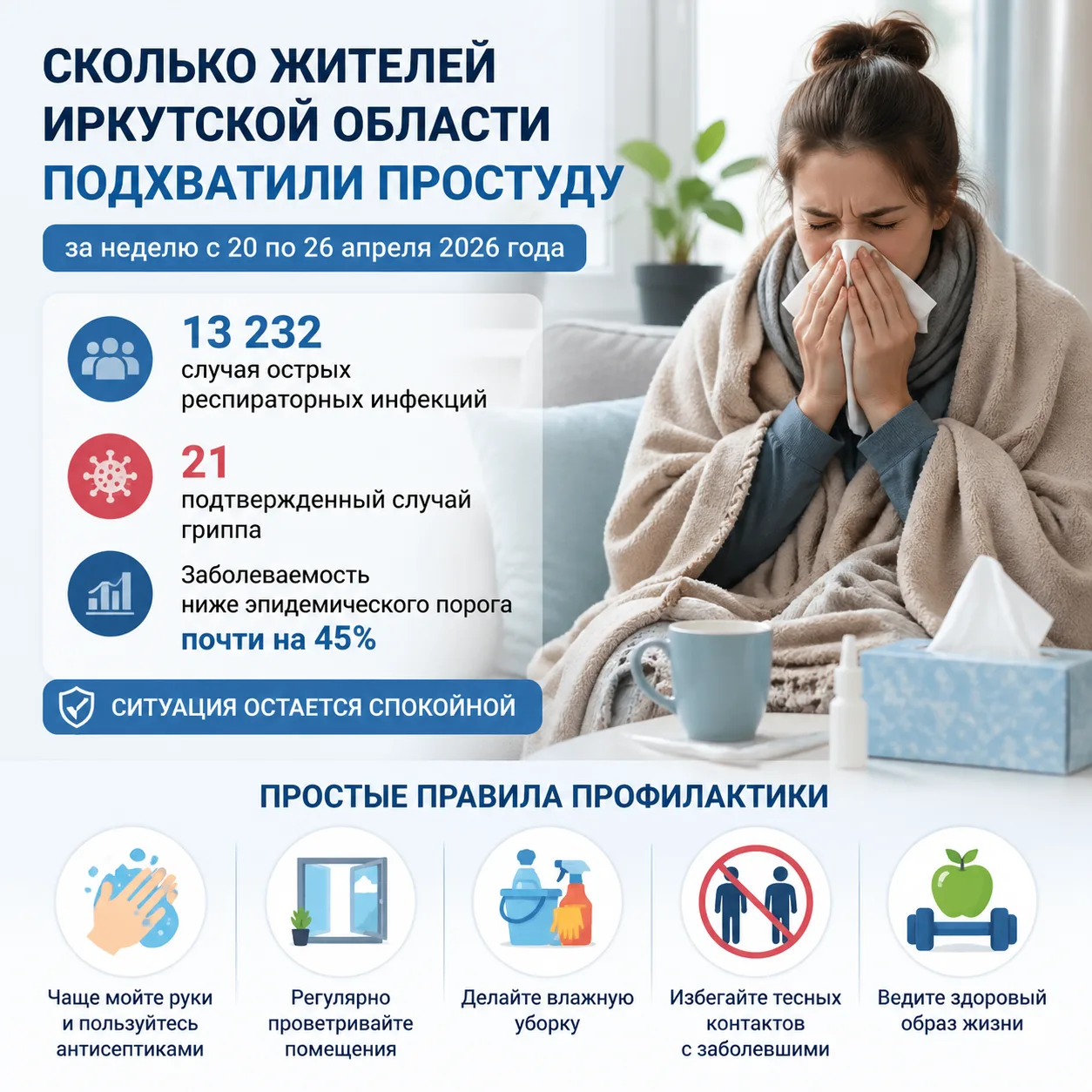 Специалисты выяснили, сколько жителей Иркутской области подхватили простуду за неделю с 20 по 26 апреля 2026 года. Об этом КП-Иркутск сообщили в региональном Управлении Роспотребнадзора.