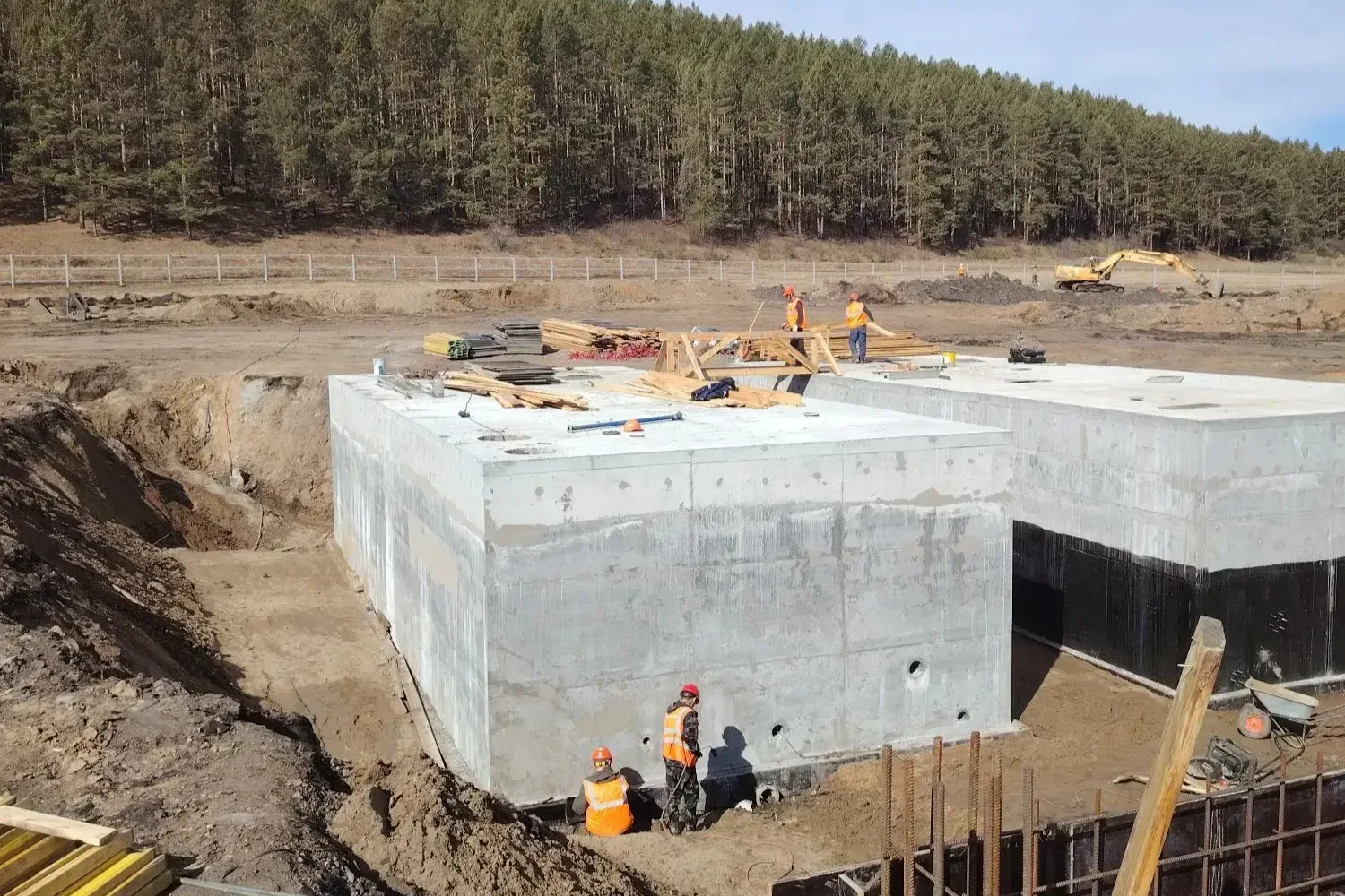 На площадке водозабора установили два резервуара для хозяйственно-питьевых нужд, возвели цокольный этаж здания водозаборного узла, там будет находиться насосное оборудование.