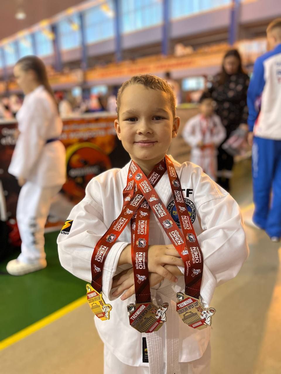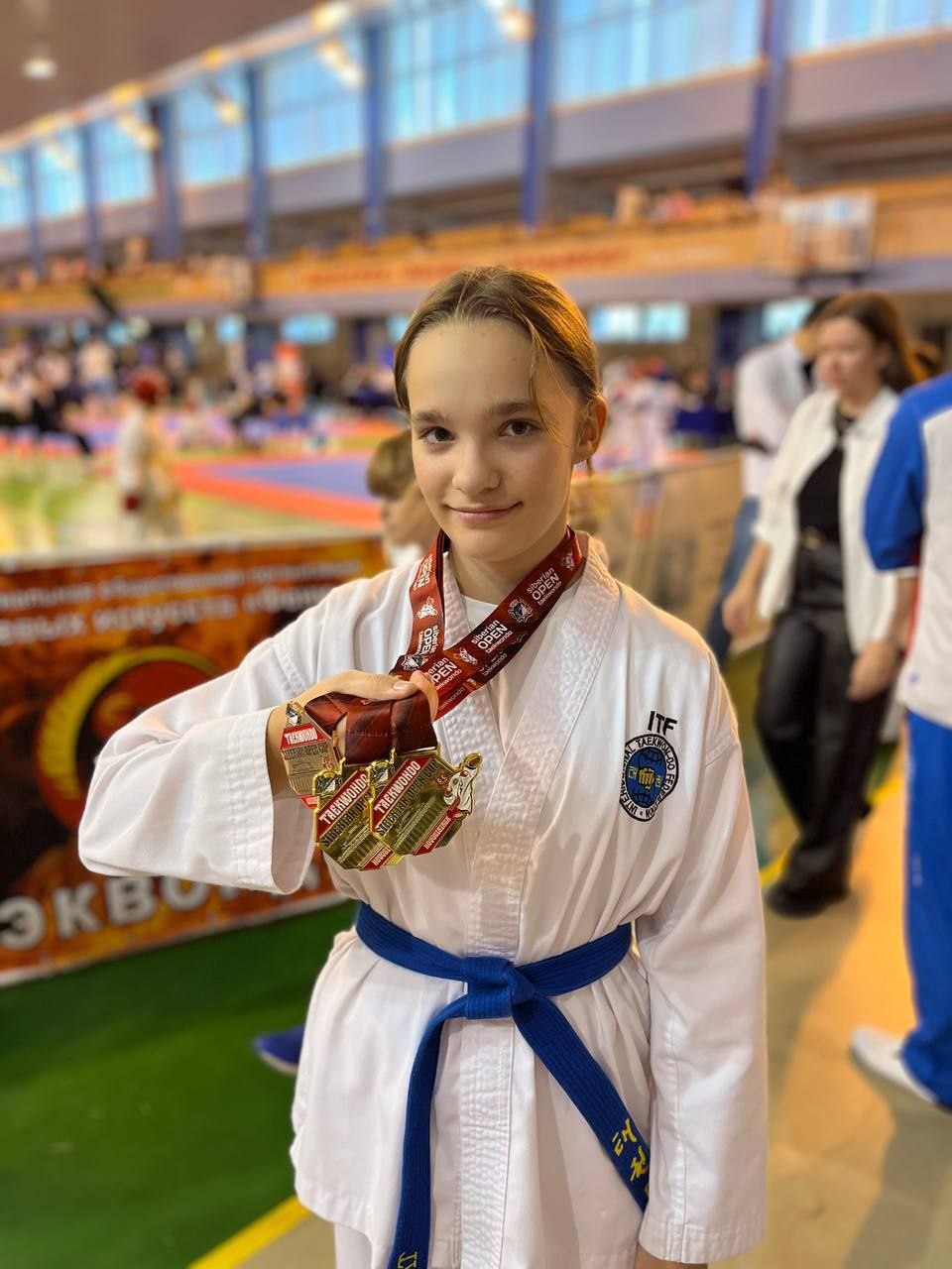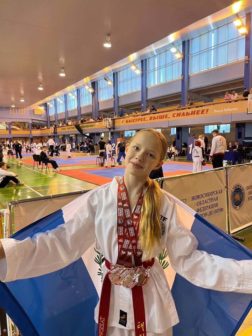 На первенстве Сибири Полина Трунова среди девушек 11-13 лет поднялась на вторую ступень пьедестала почета в формальном комплексе 9 упражнений и стала третьей в спарринге до 40 кг.