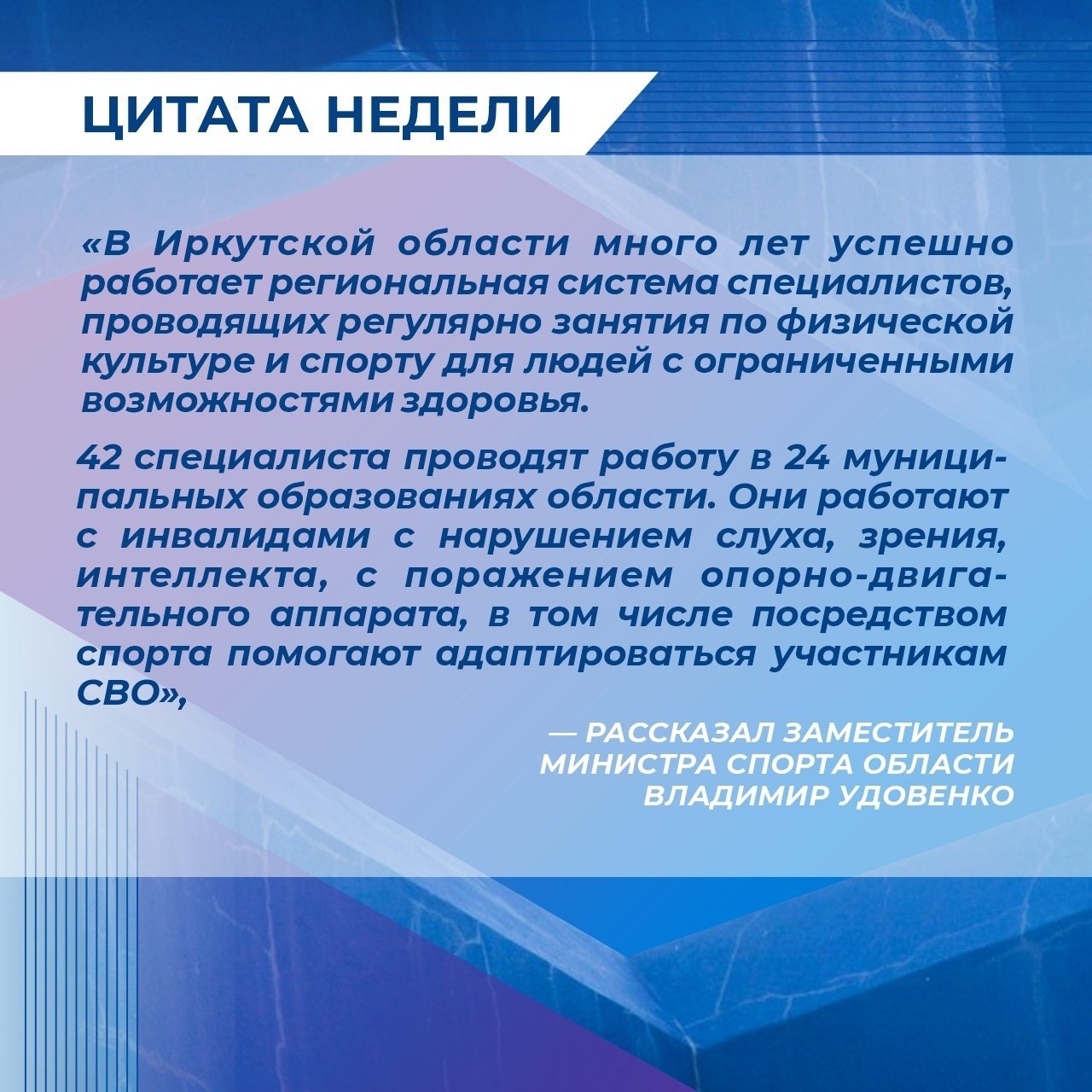 В муниципальных образованиях Иркутской области специалисты региональной системы адаптивной физической культуры и спорта проведут более 40 мероприятий в рамках Декады инвалидов. В них примут участие люди с инвалидностью, в том числе ветераны СВО.
