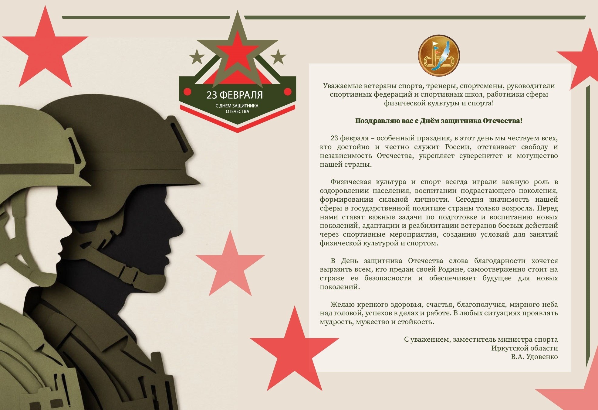 Уважаемые иркутяне!23 февраля – праздник настоящих патриотов, мужчин, обладающих воинской и гражданской честью. В этот знаменательный день мы выражаем слова глубокого уважения тем, кто выбрал нелегкий путь – служение Отчизне. Ваша сила духа...