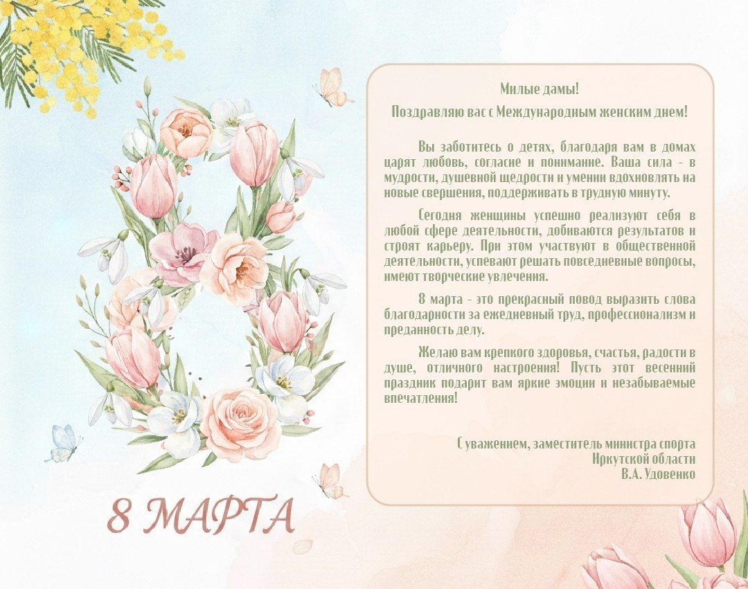 Дорогие женщины!Поздравляем с 8 мартаПусть рядом всегда будут люди, которые ценят, поддерживают и любят вас. Желаем самых искренних улыбок, исполнения желаний и как можно больше поводов для счастья.С праздником!Фото из архива IRK.ruПодпишись на новости...